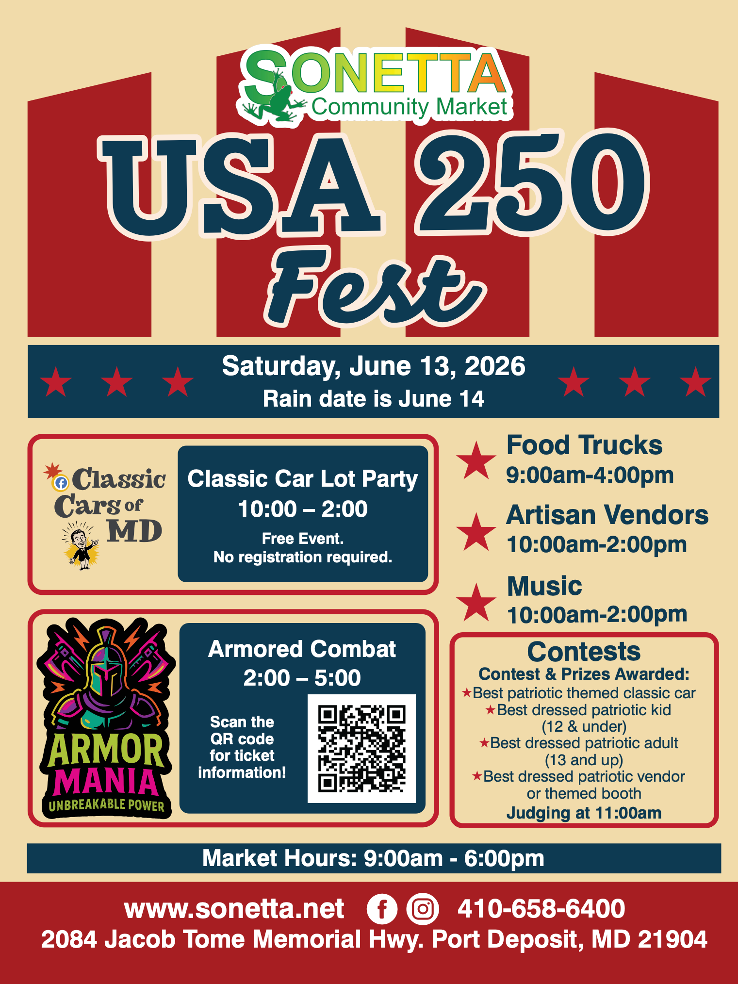 (Rain Date: Sunday, June 14th) - Location: Sonetta Community Market – Port Deposit, Maryland